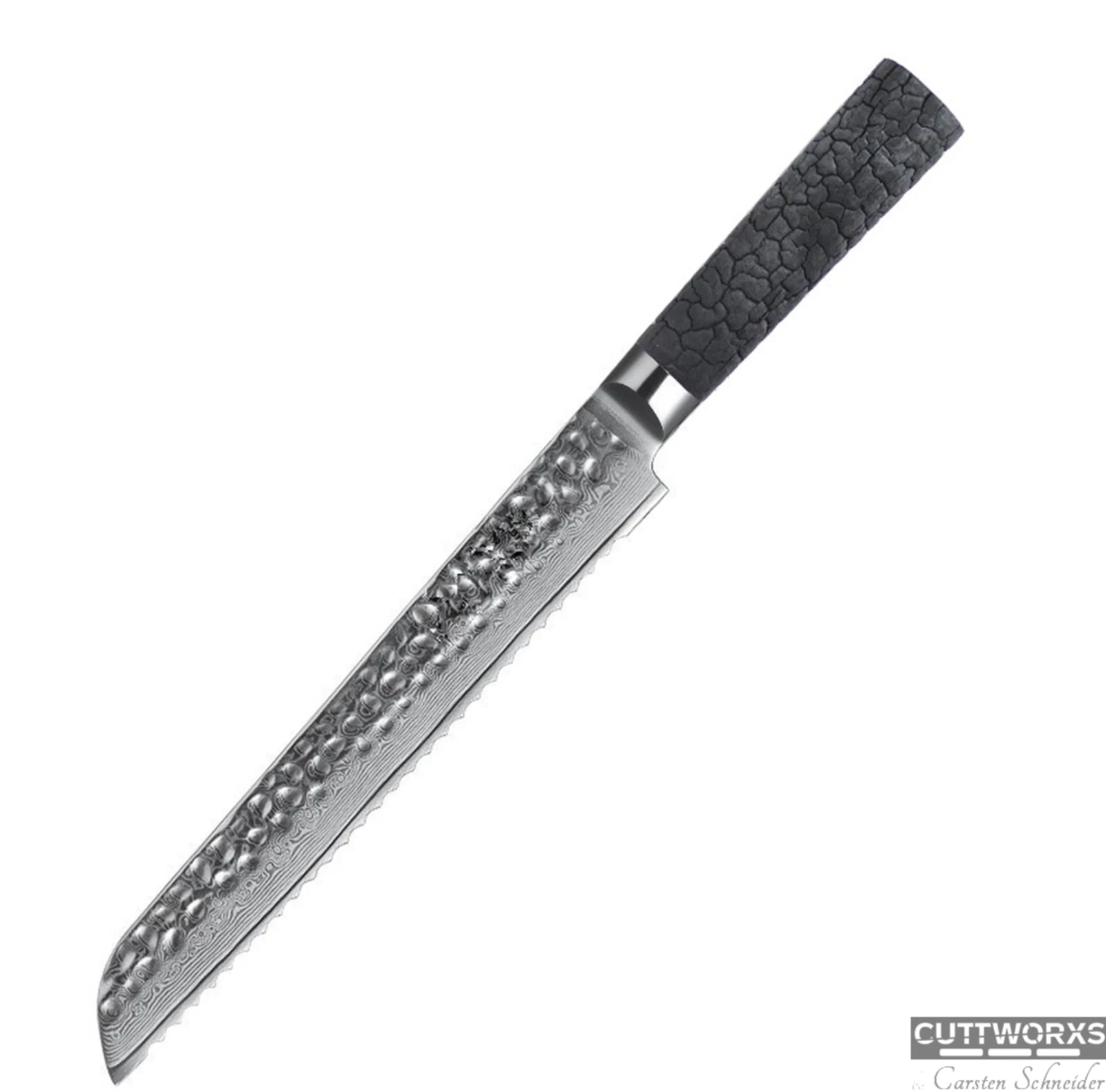 Cuttworxs brood mes geniet een zeer speciaal ontwerp. Het vlijmscherpe gekartelde lemmet van dit mes springt in het oog door zijn bijzondere vormgeving. Het gehamerde lemmet, de fijne damaststructuren en tenslotte het met FlameWOOD® gepatenteerde handvat van gebrand hout maken dit mes uniek. Zoals alle Cuttworxs messen ligt het Brood mes perfect in de hand en zorgt het voor de perfecte snede.