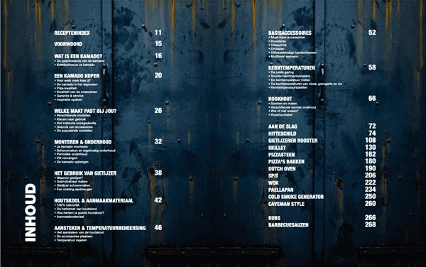 De recepten in het boek zijn handig ingedeeld per accessoire. Zo ontdek je al snel voor welke recepten je bijvoorbeeld een skillet, een pizzasteen of een gietijzeren rooster kunt gebruiken. Op deze manier leer je niet alleen je kamado, maar ook de accessoires goed kennen. Op basis van deze kennis zul je zien dat je in no time zelf gaat experimenteren met varianten op de recepten en technieken die in dit boek zijn opgenomen. Het motto van het boek is dan ook: Leer koken op een keramische BBQ, in plaats van recepten te volgen!