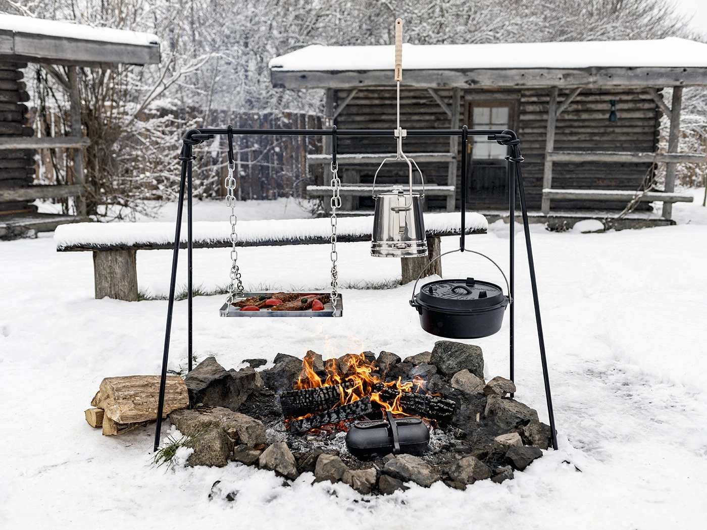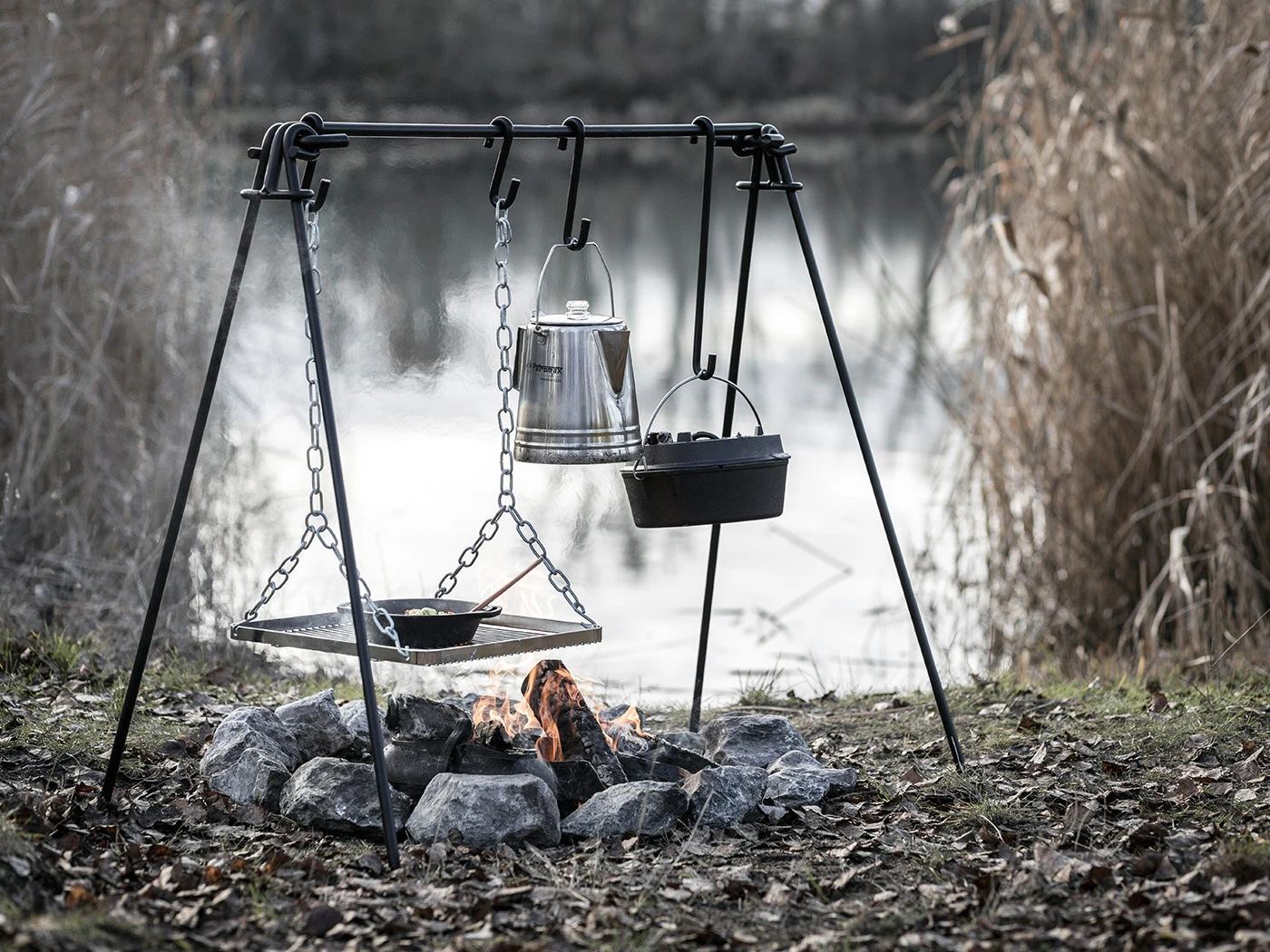 Met de Petromax vuurbrug kunnen kookpotten zoals de Dutch Oven worden opgehangen boven het vuur, waardoor de hitte gelijkmatig wordt verdeeld en de inhoud van de kookpot niet aanbrandt. Hierdoor is het mogelijk om op een veilige en effectieve manier buiten te koken met behulp van een open vuur. Je kan de pannen of ketels ophangen aan de drie haken met verschillende lengtes om zo de afstand tot het vuur aan te passen en de kooktemperatuur van je gerechten en dranken te regelen. Het grillrooster heeft een flexibele, in lengte verstelbare kettingophanging.